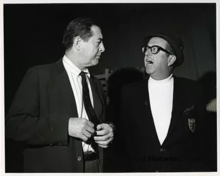 One black and white glossy photograph of Bill Kennedy (left) with comedian and actor, Phil Silvers (right). Both are well-dressed and are standing in front of a dark wall or drapery. Handwritten pencil text on the verso reads "Phil Silvers (great [interview]), Oct. 20, 1964, Elmwood [Elmwood Casino, Windsor, Ontario]."