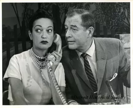 One black and white glossy photograph of actress, Dorothy Lamour, with Bill Kennedy. Both are well-dressed and are seated at a desk with a microphone. Dorothy Lamour is holding a telephone receiver to her ear and Bill Kennedy is leaning over to listen to the conversation. A fence and backdrop of painted with trees can be seen in the background. Handwritten black pen text on the verso reads "Dorothy Lamour."