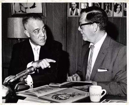 One black and white glossy photograph of actor, Ramon Navarro (left), and Bill Kennedy (right). Both are well-dressed in suits and are seated at a desk with a microphone, books, and notes. A paneled wall with framed photos is visible in the background along with a table lamp. Handwritten pencil text on the verso reads "Ramon Navarro - Wed., Sept. 5, 1962," and "appearing at Northland Playhouse in 'Flower Drum Song'." Black ink date stamps range from September 21, 1962, to December 3, 1983, to indicate photo publication dates.
