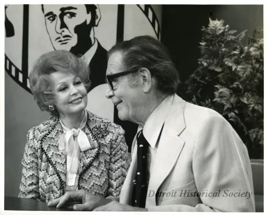 One black and white glossy photograph of actress, Arlene Dahl, and Bill Kennedy. Both are well-dressed and are seated behind an interview desk. A large piece of cinema film artwork can be seen on a wall in the left background and a tall plant can be seen at the right. Handwritten pen text on the verso reads "Arlene Dahl - July 7, 1975 (VG) [Very Good interview]" and "replaced Claudette Colbert at the Fisher in 'Marriage Go Round'."