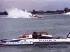 Color photograph of MISS PADDOCK POOLS, driven by Jerry Hopp, taken during the 1990 Gold Cup Races on the Detroit River. In the picture, taken during the final heat, the boat is dead in the water. MISS PADDOCK POOLS failed to start in the final heat, but finished fifth overall in the race.
