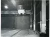 One black and white photograph (and one copy) showing the interior of a two-story warehouse-like building at McLouth Steel Corporation. The photo shows a view of two overhead rolling doors. A light fixture and HVAC ductwork are visible overhead. A trench drain with a metal cover runs along the floor and under each door. A metal trash barrel can be seen in the right background.