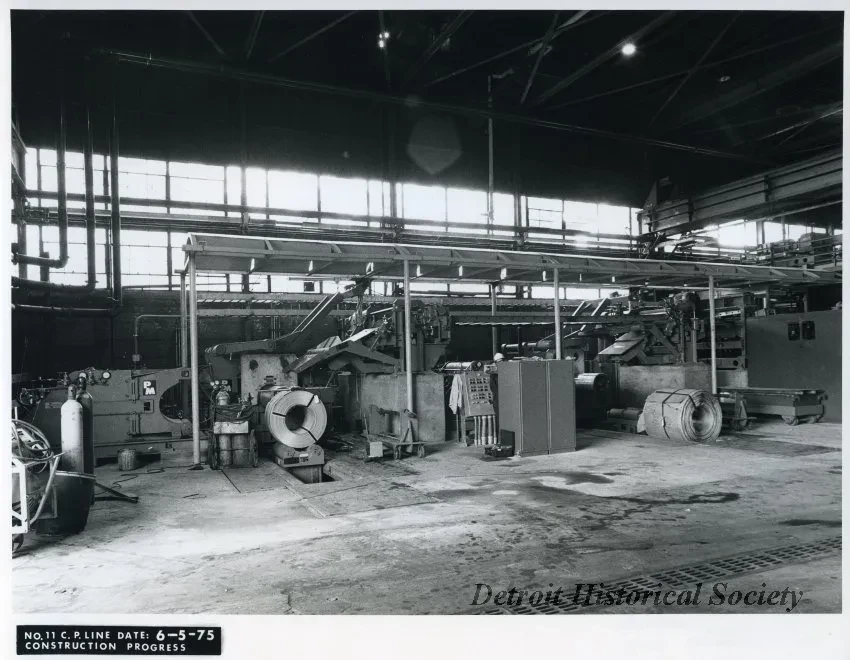 One black and white photograph (and one copy) showing the interior of a two-story factory building at McLouth Steel Corporation. The exit end of the Continuous Annealing & Pickling (CAP) line is shown along with two recoilers. The recoiler on the left has a roll of steel resting on the jack from its jack pit. Another roll of steel rests on the floor to the right of the second recoiler. A set of control panels is visible between the two recoilers behind power station. Three machines have the Production Machinery (PM) logo on the side. At the right, a gantry crane track is visible, and beyond that, the upper level CAP line is just visible. A black box with white text in the lower left corner reads "NO. 11 C.P. LINE DATE: 6-5-75 CONSTRUCTION PROGRESS".
