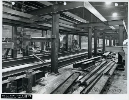 One black and white photograph (and one copy) showing the interior of a two-story factory building at McLouth Steel Corporation. The two-level Continuous Annealing & Pickling (CAP) line is shown under construction. The CAP line is a series of support beams and columns. Various materials lie on the floor to the right of the line. Several ladders are propped against the wall in the background. A black box with white text in the lower left corner reads "NO. 11 C.P. LINE DATE: 1-30-75 CONSTRUCTION PROGRESS".