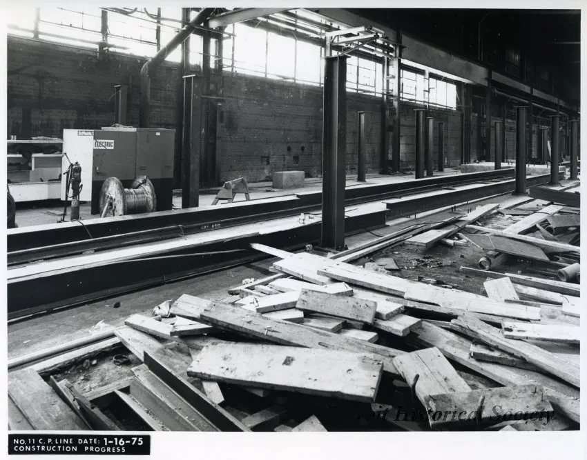 One black and white photograph (and one copy) showing the interior of a two-story factory building at McLouth Steel Corporation. The lower section of the two-level Continuous Annealing & Pickling (CAP) line is shown under construction. A series of support posts stand to the left. Beams awaiting installation are stacked on the ground. Tool carts and a wood spool stand behind the line to the left. Scraps of wood are piled to the right of the line. A black box with white text in the lower left corner reads "NO. 11 C.P. LINE DATE: 1-16-75 CONSTRUCTION PROGRESS".