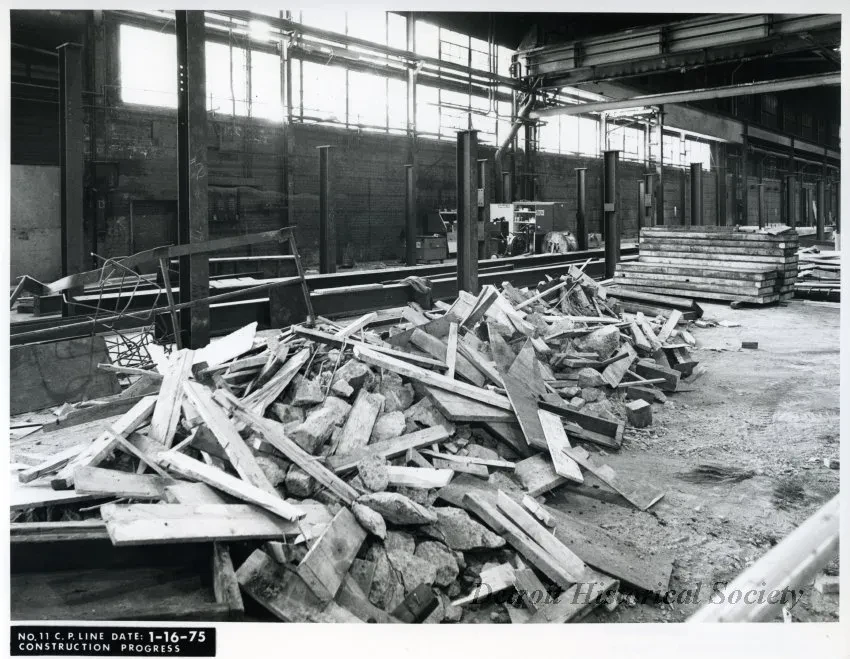 One black and white photograph (and one copy) showing the interior of a two-story factory building at McLouth Steel Corporation. The two-level Continuous Annealing & Pickling (CAP) line is shown under construction. A series of support posts stand in the background. In the right background, beams awaiting installation are stacked on the floor along with a stack of wooden planks. In the far background behind the CAP line, several tool carts are visible. In the foreground, a pile of wood scraps and broken concrete is visible. A black box with white text in the lower left corner reads "NO. 11 C.P. LINE DATE: 1-16-75 CONSTRUCTION PROGRESS".