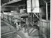 One black and white photograph (and one sepia toned copy) showing a set of acid baths and wash tanks at McLouth Steel Corporation. Two thin strips of steel can be seen entering the first tank over a roller. The roller and cover of the tank have white discoloration. Pieces of wood are stacked on the left.