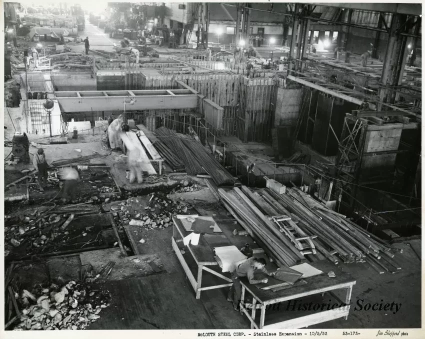 One black and white photograph showing the interior of a factory building at McLouth Steel Corporation. Two work tables stand in the foreground and a worker leans over one table while reviewing a set of plans. Scraps of wood, metal, and broken concrete are stacked on the floor around the work tables. Wood formwork for new concrete construction can be seen in the center background. Rolls of steel are stacked in the far left background. Typed text along the bottom of the photograph reads "McLouth Steel Corp.---Stainless Expansion 10/5/53 53-173-." Printed text in the right corner: "Jim Shepperd Photo."