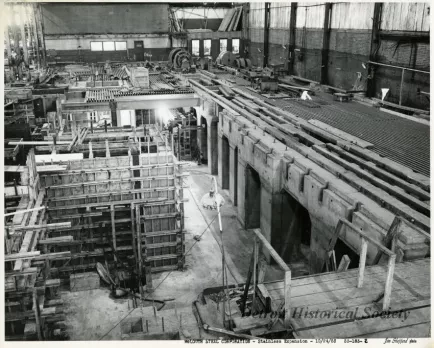 One black and white photograph showing the interior of a factory building at McLouth Steel Corporation. An elevated view of a sunken area is shown. Sheets of corrugated metal cover the area to the right and in the background. A brick office stands in the background on the upper level. A motor generator stands in front of the office. Concrete arches can be seen on the lower level at the right. Typed text along the bottom of the photograph reads "McLouth Steel Corp.---Stainless Expansion 10/24/53 53-183-2." Printed in the right corner: "Jim Shepperd Photo."