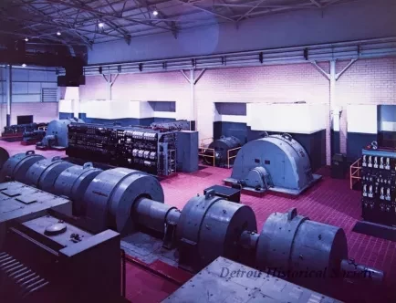 One color photograph showing the interior of a factory building at McLouth Steel Corporation. The photo shows a view of the motor generator room for the stainless steel line. Several "General Electric (GE)" generators and control panels line the floor.