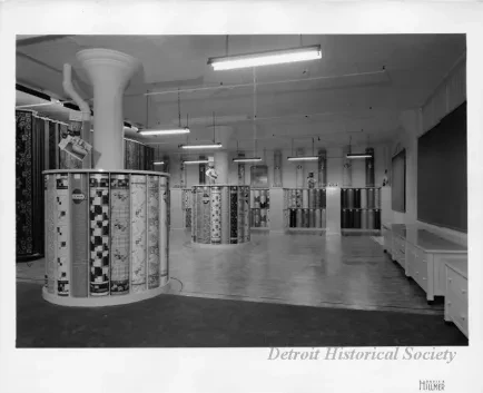 Print. Black and white photographic print of the interior retail display for Sloane-Blabon Linoleum flooring available at The J.L. Hudson Company Department Store. Rolls of linoleum in various colors, styles, and patters are featured throughout the display. Oriental floor rugs are hung on display in the left background. Rolls of linoleum have been placed around heating and cooling pipes to disguise them. Signage in the central background placed above the display of linoleum reads, "Sloane-Blabon Linoleum Style Leaders." The photographer's name is printed on the bottom of the recto, "Davis B. Hillmer."