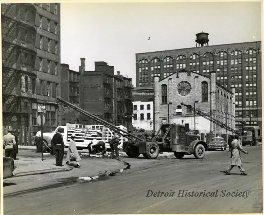 One black and white photograph of a soda delivery truck which has lost some of its load. The view looks northeastward toward the intersection of Woodbridge and Bates Streets and shows the delivery truck parked at the northeast corner. Two workmen are gathering bottles and wooden carrier trays that are resting on the pavement. A trail of liquid from broken bottles can be seen on the pavement in the foreground. A crane truck is parked nearby and the driver is adjusting a cable at the back. Several pedestrians and onlookers are viewing the scene in the foreground. Various multi-story brick office buildings, including the A. Krolik Building, can be seen in the background and the recently-relocated Mariners' Church can be seen in the right background.