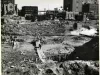 One black and white photograph of construction work that is underway for the new Civic Center redevelopment project near Mariners' Church. The view looks east southeastward toward Atwater Street and shows a large area of excavation in the foreground. The recently-relocated Mariners' Church can be seen in the background near the upper left corner of the photo. Signs and buildings at the entrance to the vehicle tunnel to Canada can be seen in the center and right background.