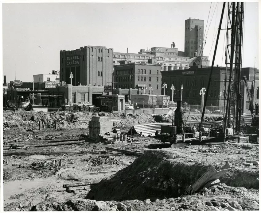 One black and white photograph of construction work that is underway for the new Civic Center redevelopment project near Mariners' Church. The view looks southeastward toward Atwater Street and shows a large area of excavation in the foreground as well as a pile driver, stacks of supplies, and stacks of pipe sections. Signs and buildings at the entrance to the vehicle tunnel to Canada can be seen in the left and center background. The Robin Hood Flour Company factory is visible in the far center background.
