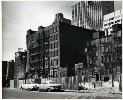 One black and white photograph (and one copy) of the back side of a row of old 2-story to 7-story commercial buildings that are to be demolished as part of the Civic Center redevelopment project. The view looks northwestward and shows Woodbridge Street and two parked cars in the foreground with the commercial buildings visible in the background. The Norton Hotel can be seen in the background at the left. The tops of the Guardian Building and the new City-County Building can be seen in the far background at the center and left side of the photo.