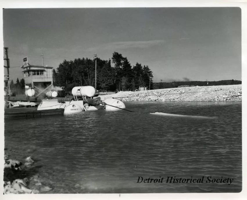 One black and white photograph of the Merritt-Chapman & Scott Corporation construction staging area for the Lakehead Pipeline crossing of the Straits of Mackinac. The photo shows a long section of steel pipeline which is resting on a cradle with rollers at the shoreline and is ready for pulling into Lake Michigan. The end of the pipeline is resting on a floating cradle and has a large steel float attached to the top. A cable is attached to the pipe end. In the left background, a "Control Tower" building can be seen on shore. Evergreen trees and a rip rap breakwater are visible in the center and right background. Black ink stamps on the verso read "Merritt-Chapman & Scott Corp. Photo," and "Sep. 17, 1953." The staging area was located west of St. Ignace, Michigan, at Pointe La Barbe.