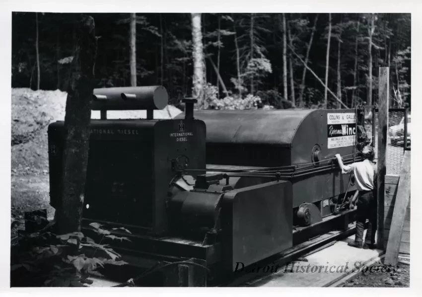 One black and white photograph of one of the winch engines that was used to pull the Lakehead Pipeline across of the Straits of Mackinac. The photo shows a back corner view of the large diesel-powered winch which is mounted on a concrete slab in a construction staging area. A workman is standing beside the engine and has his left hand resting on a conduit. A sign on the side of the winch reads "Collins & Gallucci, Houston - New York, Riverman Winch, Max Single Line Pull 425,000 Lbs., Designed & Built by Collins Construction Co.-Victoria Machine [?]." Evergreen trees are visible in the background.