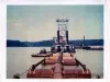 One color photograph of the hydraulic (suction) dredge, ALABAMA, of the Dunbar & Sullivan Dredging Company. The photo shows a stern view of the vessel which is at work near Yellow Creek (Yellow Creek State Inland Port), Mississippi, on the Tennessee-Tombigbee Waterway. A floating discharge pipeline can be seen in the foreground off the transom of the dredge. The waterway, several barges, and a treed shoreline can be seen in the background. Handwritten blue ink text on the verso reads "5 July '76 - Dredge Alabama, from pontoon line to stern, Yellow Creek, MS."