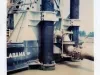 One color photograph of the spud support framework on the hydraulic (suction) dredge, ALABAMA, of the Dunbar & Sullivan Dredging Company. The photo shows a view of the truss framework and two spud piles at the vessel transom. Muddy water is visible in the foreground along with a discharge pipe that is located between the two piles. Handwritten blue ink text on the verso reads "5 July '76 - Dredge Alabama, Yellow Creek, MS. From stern pontoon to port stern."