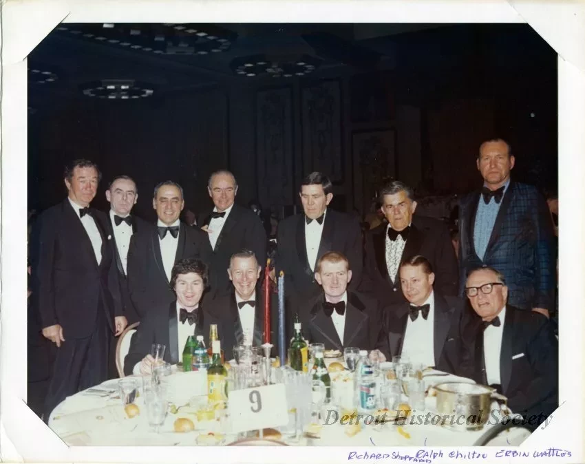 One color photograph of a group of 12 businessmen who are attending a convention at the New York Hilton Hotel at Rockefeller Center. All are attired in formal wear and a seated or standing beside a large round banquet table. Handwritten blue ink text along the lower right edge of the photo identifies three men seated at the far right as "Richard Sheppard, Ralph Chilton, and Erbin Wattles" who were from the Dunbar & Sullivan Dredging Company. (The other men may have also been from Dunbar & Sullivan or possibly their affiliated companies.) The photo is contained in a heavyweight paper folder which has a color photographic image of the hotel on the front. Additional color photographic images are shown on the back cover along with printed black text that reads "For reorders please send check of money order with this photo and date taken to Cashman Photo Enterprises, Inc. Your photo will be returned with your order. New York Hilton, 1335 6th Ave., New York, N.Y. 10019."