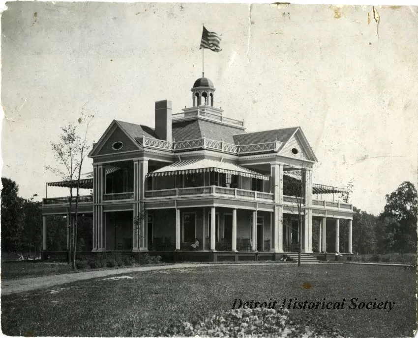 Black and white photo of the exterior of the Palmer Park Casino. A woman sits in a rocking chair on the building's promenade. An America flag is flown from its cupola.