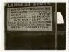 Black and white photo of the sign beneath the World's Largest Stove at the State Fair Grounds. The sign reads: