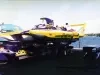 Color photograph of SMOKIN' JOE'S, driven by Mark Tate, taken during the 1995 Gold Cup Race on the Detroit River. The boat is sitting on its trailer in the pits with two crew members on board.