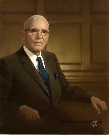 One color photograph of Harry A. Young who was one of the founding members of Kiwanis Club No. 1 in Detroit. He is wearing a dark brown suit with a white shirt and a blue tie and is seated in a chair. A wood paneled wall is visible in the background. A gold-colored stamp in the lower right corner reads "Hollett of Arizona."