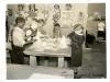 One sepia-toned photograph (and one 11" x 14" black and white copy) of students at Children's House, an art center for children in Detroit. The photograph shows students standing around a table and creating masks and a helmet with papier-maché. Two boys at the left side of the photo are creating a mask, and a girl at the right is making a helmet. The boy standing beside the girl is smiling faintly as he watches the boys making masks. In the background, completed masks and paintings are hanging on the wall. Handwritten pencil text on the verso of the original states, "just groups." Handwritten text on the verso of the copy states, "mask making."