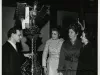 Black & white photo depicting four people standing around a metal statue inside Fort Street Presbyterian Church.