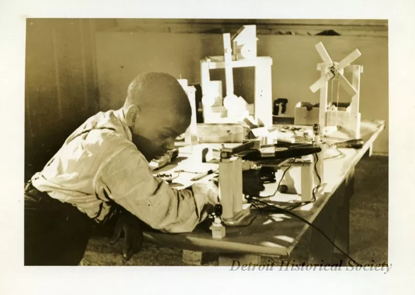 One black and white photograph of a student at Children's House, an art center for children in Detroit. The photograph shows an African American boy who is working on a woodworking project. He is leaning against a table as he uses a small power tool. Other woodworking projects can be seen on the table in the background.