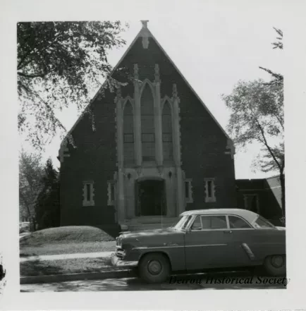 Black & white photo depicting East Bethlehem Lutheran Church on the southeast corner of Outer Drive and Mound Road.