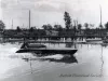 Black and white photograph of TEMPO VI leaving the harbor, probably Kean's Yacht Harbor on the Detroit River. The boat was owned and driven by Guy Lombardo.
