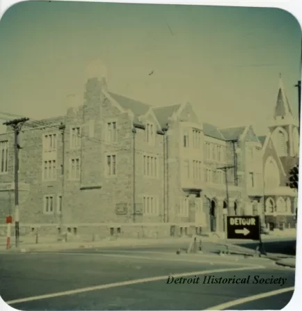 Color photo depicting the First English Evangelical Lutheran Church and Parish House along the west side of Mt. Elliot Street between Mack Avenue and Pulford Street.