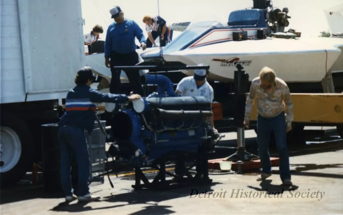 Color photograph taken during the 1986 Gold Cup Races of THOR RACING, driven by Jerry Hopp, on her trailer in the pits. In the foreground members of the crew are working on one of her Allison engines. The boat failed to qualify for the race.