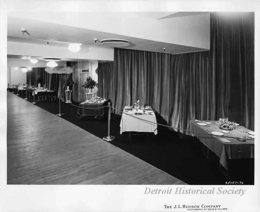 Print. (2 Copies.) Black and white photographic print of a tableware exhibition held at The J.L. Hudson Company Department Store. A series of tables, set with ceramic dishware, simple table clothes, ceramic dishware, drinking glasses, wine glasses, and small floral arrangements, are featured. Signage in the left background reads, "Silver Exhibit." The tables visible behind the sign are more ornate and feature candlesticks as well as silver. The photographic sequence number, company name, and photographer's name are printed on the bottom of the recto, "25157-7x; The J.L. Hudson Company; Photography by Davis B. Hillmer."