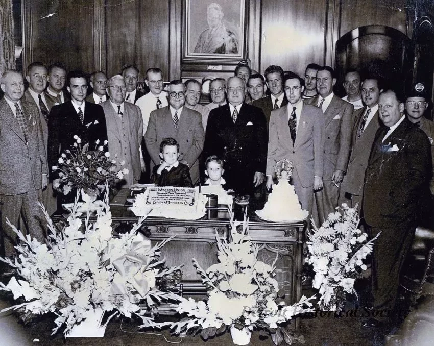 One black and white reproduction photograph of a large group of Dossin's Food Products officers, employees, and/or Miss Pepsi crew members. All are well-dressed in business suits and are standing behind a desk which has a vase of flowers on top along with a large rectangular cake and a small round tiered cake. Three large vases with flowers are resting on the floor in front of the desk. Dark paneled walls are visible in the background. The rectangular cake has text on top that resembles a "Western Union" telegram to "Dossin Food Products" from the "Simons-Michelson Co.," however, the message text is unreadable. Two of the company owners, Roy Dossin (left) and Russell Dossin (right) are standing behind the desk at the center with two young boys who may be their grandsons. Ernest Dossin is standing fourth from the left. The others are not identified.