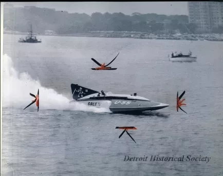 Request ImageBlack and white photograph of unlimited hydroplane GALE V, driven by Lee Schoenith, on the Detroit River. The Detroit shoreline can be seen in the background.