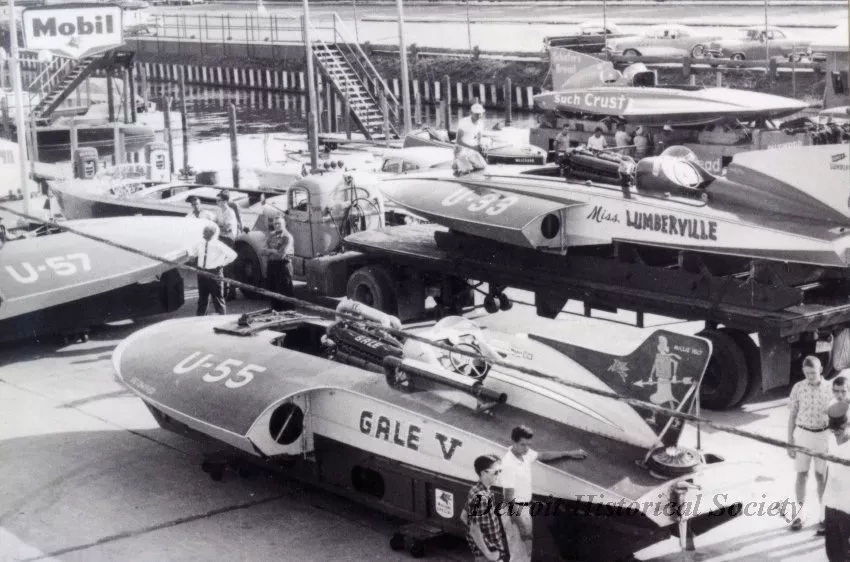 Black & white photograph of hydroplanes at the Roostertail Marina. In the foreground is GALE V, behind her is MISS LUMBERVILLE, and behind her at the back of the picture is SUCH CRUST IV. At the far left is the bow and starboard sponson of GALE VII.