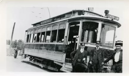 Black and white photo of Detroit United Railway streetcar number 1290, assigned to the Harper Avenue route. A destination sign reading, "Center-Line" is posted at the front of the car. Two conductors and a man in a boater hat pose in front of the car. Several passengers are visible on board. A woman walks behind the car in the background. "Detroit United Rys 1290," is stamped on the verso.