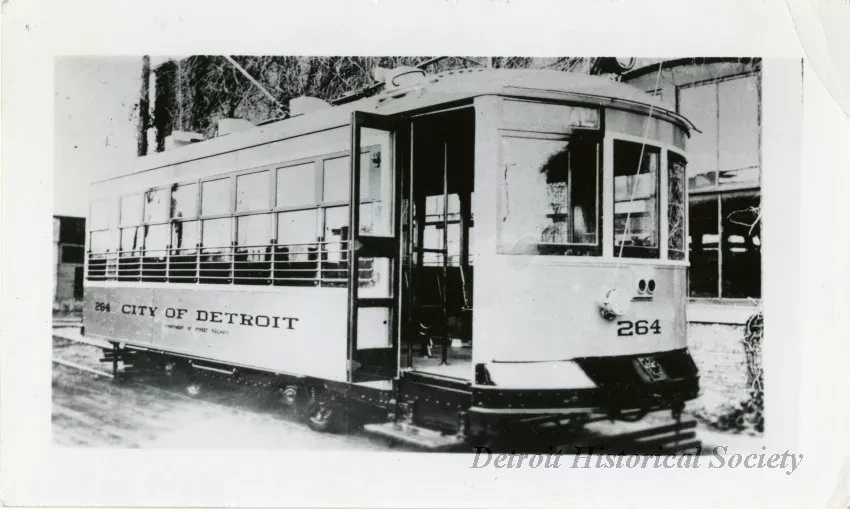 Black and white photo of Department of Street Railways car number 264, a McGuire-Cummings Manufacturing Company-built Birney Safety Car. "Detroit Dept. St. Rys. #264," is stamped on the verso.