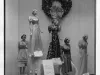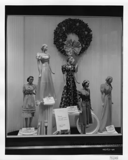 Print. Black and white photographic print of a window display is advertising Talon Slide Fasteners available at The J.L. Hudson Company Department Store. The window features five female mannequins, each wearing a differing style of and type of dress including day wear, and evening wear. Signage in the central foreground reads, "Its Christmas Time at Hudson's, Talon Slide Fasteners For Your Christmas Sewing, First Floor, Farmer." A large Christmas wreath is affixed to the rear of the display. The photographic sequence number, and photographer's name are printed on the bottom of the recto, "18352-6x; Davis B. Hillmer."