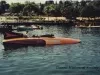Color photograph of FASCINATION, probably taken at Seattle, Washington. The driver appears to be putting on his helmet, and about to start up the boat. A crowd of spectators can be seen on shore in the background.