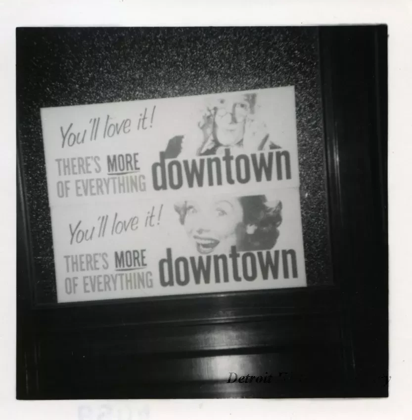 One black and white photograph of two "Downtown Detroit Days" advertisement posters. One poster shows a drawing of the face of an older woman who is adjusting her glasses and the other poster shows the face of a smiling young woman. Printed text on both posters reads "You'll love it! There's more of everything downtown." Both posters appear to be mounted on a dark-colored bulletin board or wall.