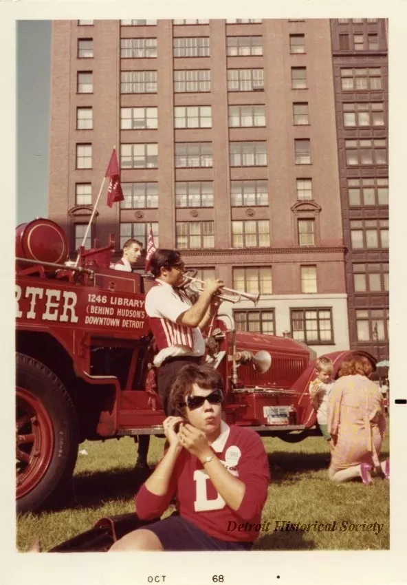 One color photograph of an old fire truck that is parked on a lawn area on the Kern Block (site of the former Kern's department store) in downtown Detroit. A young woman, who is a publicity spokesperson for Downtown Detroit Days, is seated on the lawn in the foreground and is wearing a read sweater with a white letter "D," on the front. A member of the Red Garter Band is standing behind her and is playing a trumpet. White text on the side of the truck reads "Red Garter, 1246 Library (Behind Hudson's) Downtown Detroit." The Gratiot Avenue side of Hudson's department store can be seen in the left background. Handwritten blue ink text on the verso reads "D-D-Days - Fall, '68."