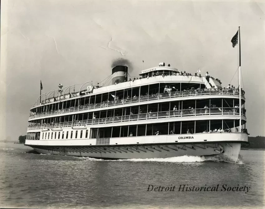 One sepia-toned photograph of the excursion ship, SS COLUMBIA, of the Bob-Lo Company. The photo shows a starboard side view of the vessel which is underway in fair weather on the Detroit River. The decks are crowded with passengers. Shorelines are visible in the background at the left and right edges of the photo.