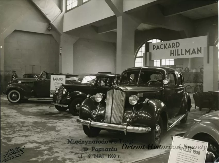 Black and white photographic print taken inside depicting three Packard automobiles on display at the Poznan International Fair in Poland. A sign in the background reads: Packard Hillman. Label 1938 Inner Circle.