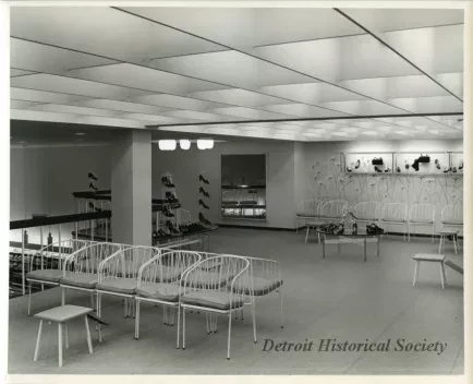 Black and white photographic print of the interior of the Detroit Winkelman's store, featuring several displays in the women's shoe department and looking toward the first floor.