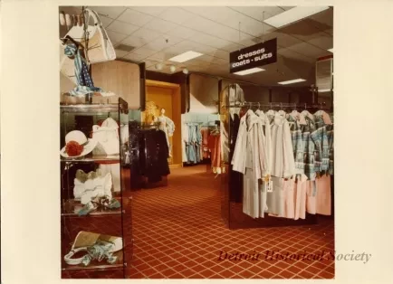 Request ImageColor photographic print depicting displays of women's dresses, coats, suits, hats, and purses in a Winkelman's department store.