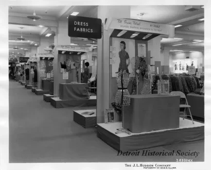 Print. Black and white photographic print of interior displays for the Fall Sewing Festival held in the Fabric Department at The J.L. Hudson Company Department Store. Small displays are each affixed to an individual pilaster on the right side of aisle way. The display in the foreground is advertising, "My Double - Adjustable Dress Form." Signage affixed to the top of the display reads, "Fall Sewing Festival My Double, Adjustable dressforms, demonstration by Eva Ronell." The dress form is featured as well as a small stage for the demonstration. Directional signage affixed to the pilaster reads, "Dress Fabrics." Also featured in the small displays are "Wrights Tricks with Tape and Braids," and "Sewing Tricks." A large selection of dress fabrics are visible in the background. The photographic sequence number, company name, and photographer's name are printed on the bottom of the recto, "28331-2x; The J.L. Hudson Company; Photography by Davis B. Hillmer."